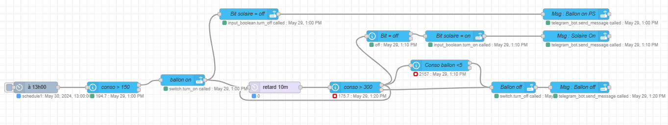 [{"id":"dc6b9d3f7861a14d","type":"cronplus","z":"dd8126bdccffbd90","name":"à 13h00","outputField":"payload","timeZone":"","storeName":"","commandResponseMsgOutput":"output1","defaultLocation":"","defaultLocationType":"default","outputs":1,"options":[{"name":"schedule1","topic":"topic1","payloadType":"default","payload":"","expressionType":"cron","expression":"0 0 13 * * *","location":"","offset":"0","solarType":"all","solarEvents":"sunrise,sunset"}],"x":180,"y":980,"wires":[["abb01b8759cea4e1"]]},{"id":"8183de4da78ce088","type":"api-call-service","z":"dd8126bdccffbd90","name":"ballon on","server":"4066b510aa00d654","version":5,"debugenabled":false,"domain":"switch","service":"turn_on","areaId":[],"deviceId":[],"entityId":["switch.ballon"],"data":"","dataType":"json","mergeContext":"","mustacheAltTags":false,"outputProperties":[],"queue":"none","output_location":"payload","output_location_type":"none","x":580,"y":960,"wires":[["deb55a97464488ca","54a465af6cfa517f"]]},{"id":"3c565f20b1df6e1e","type":"api-call-service","z":"dd8126bdccffbd90","name":"Ballon off","server":"4066b510aa00d654","version":5,"debugenabled":false,"domain":"switch","service":"turn_off","areaId":[],"deviceId":[],"entityId":["switch.ballon"],"data":"","dataType":"json","mergeContext":"","mustacheAltTags":false,"outputProperties":[],"queue":"none","output_location":"payload","output_location_type":"none","x":1480,"y":980,"wires":[["3f87031157c2be35"]]},{"id":"deb55a97464488ca","type":"delay","z":"dd8126bdccffbd90","name":"","pauseType":"delay","timeout":"10","timeoutUnits":"minutes","rate":"1","nbRateUnits":"1","rateUnits":"second","randomFirst":"1","randomLast":"5","randomUnits":"seconds","drop":false,"allowrate":false,"outputs":1,"x":830,"y":980,"wires":[["566f42ef0fd6471c"]]},{"id":"abb01b8759cea4e1","type":"api-current-state","z":"dd8126bdccffbd90","name":"conso > 150","server":"4066b510aa00d654","version":3,"outputs":2,"halt_if":"150","halt_if_type":"num","halt_if_compare":"gt","entity_id":"sensor.conso_ps","state_type":"str","blockInputOverrides":false,"outputProperties":[{"property":"payload","propertyType":"msg","value":"","valueType":"entityState"},{"property":"data","propertyType":"msg","value":"","valueType":"entity"}],"for":"0","forType":"num","forUnits":"minutes","override_topic":false,"state_location":"payload","override_payload":"msg","entity_location":"data","override_data":"msg","x":390,"y":980,"wires":[["8183de4da78ce088"],[]]},{"id":"566f42ef0fd6471c","type":"api-current-state","z":"dd8126bdccffbd90","name":"conso > 300","server":"4066b510aa00d654","version":3,"outputs":2,"halt_if":"300","halt_if_type":"num","halt_if_compare":"gt","entity_id":"sensor.conso_ps","state_type":"str","blockInputOverrides":false,"outputProperties":[{"property":"payload","propertyType":"msg","value":"","valueType":"entityState"},{"property":"data","propertyType":"msg","value":"","valueType":"entity"}],"for":"0","forType":"num","forUnits":"minutes","override_topic":false,"state_location":"payload","override_payload":"msg","entity_location":"data","override_data":"msg","x":1050,"y":980,"wires":[["7c3fad8086453789","deb55a97464488ca","e09d6c568cdd6933"],["3c565f20b1df6e1e"]]},{"id":"7c3fad8086453789","type":"api-current-state","z":"dd8126bdccffbd90","name":"Conso ballon <5","server":"4066b510aa00d654","version":3,"outputs":2,"halt_if":"5","halt_if_type":"num","halt_if_compare":"lt","entity_id":"sensor.ballon_power","state_type":"str","blockInputOverrides":false,"outputProperties":[{"property":"payload","propertyType":"msg","value":"","valueType":"entityState"},{"property":"data","propertyType":"msg","value":"","valueType":"entity"}],"for":"0","forType":"num","forUnits":"minutes","override_topic":false,"state_location":"payload","override_payload":"msg","entity_location":"data","override_data":"msg","x":1280,"y":920,"wires":[["3c565f20b1df6e1e"],[]]},{"id":"54a465af6cfa517f","type":"api-call-service","z":"dd8126bdccffbd90","name":"Bit solaire = off","server":"4066b510aa00d654","version":5,"debugenabled":false,"domain":"input_boolean","service":"turn_off","areaId":[],"deviceId":[],"entityId":["input_boolean.bit_solaire"],"data":"","dataType":"json","mergeContext":"","mustacheAltTags":false,"outputProperties":[],"queue":"none","output_location":"","output_location_type":"none","x":760,"y":780,"wires":[["abeb112e49d39437"]]},{"id":"abeb112e49d39437","type":"api-call-service","z":"dd8126bdccffbd90","name":"Msg : Ballon on PS","server":"4066b510aa00d654","version":5,"debugenabled":false,"domain":"telegram_bot","service":"send_message","areaId":[],"deviceId":[],"entityId":[],"data":"{\"message\":\"Ballon On PS\"}","dataType":"jsonata","mergeContext":"","mustacheAltTags":false,"outputProperties":[],"queue":"none","x":1650,"y":780,"wires":[[]]},{"id":"3184bc4e7b1378c7","type":"api-call-service","z":"dd8126bdccffbd90","name":"Bit solaire = on","server":"4066b510aa00d654","version":5,"debugenabled":false,"domain":"input_boolean","service":"turn_on","areaId":[],"deviceId":[],"entityId":["input_boolean.bit_solaire"],"data":"","dataType":"json","mergeContext":"","mustacheAltTags":false,"outputProperties":[],"queue":"none","output_location":"","output_location_type":"none","x":1320,"y":840,"wires":[["81f9dc98d14d4a97"]]},{"id":"81f9dc98d14d4a97","type":"api-call-service","z":"dd8126bdccffbd90","name":"Msg : Solaire On","server":"4066b510aa00d654","version":5,"debugenabled":false,"domain":"telegram_bot","service":"send_message","areaId":[],"deviceId":[],"entityId":[],"data":"{\"message\":\"Solaire on\"}","dataType":"jsonata","mergeContext":"","mustacheAltTags":false,"outputProperties":[],"queue":"none","x":1650,"y":840,"wires":[[]]},{"id":"e09d6c568cdd6933","type":"api-current-state","z":"dd8126bdccffbd90","name":"Bit = off","server":"4066b510aa00d654","version":3,"outputs":2,"halt_if":"off","halt_if_type":"str","halt_if_compare":"is","entity_id":"input_boolean.bit_solaire","state_type":"str","blockInputOverrides":false,"outputProperties":[{"