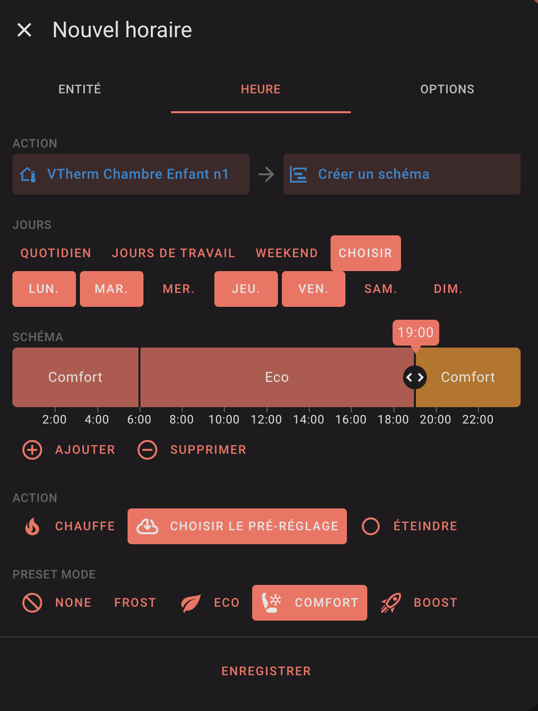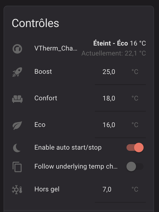 Je vais faire un test en cochant l’option Follow underlying temp change, qui est décochée depuis que j’ai installé ton intégration. (c’est l’inverse de ce que tu suggères, mais je me dis que cela vaut le coup d’essayer)