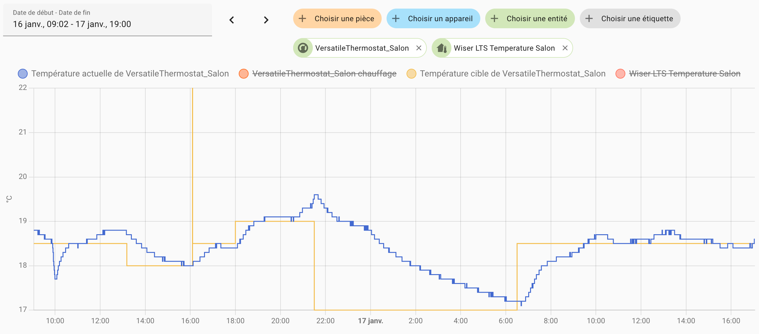 Donc pour faire ça, j’ai décalé le démarrage du matin du VTherm des radiateurs et j’ai décalé d’un demi degré les consignes de la clim pour qu’elle démarre en premier. J’ai aussi 2 thermomètres dont le plus froid (près de la fenêtre) est connecté à la clim. Comme ça elle démarre avant.