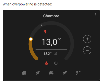 Le FP du radiateur ainsi que l’icône des 6 modes s’affiche bien selon ce que j’envoie en Zigbee au module Nodon mais j’ai un radiateur qui après quelques heures en mode FP arrêt switch en boucle entre confort et FP arrêt et je vois dans la courbe de puissance des pics à plus de 1900W.