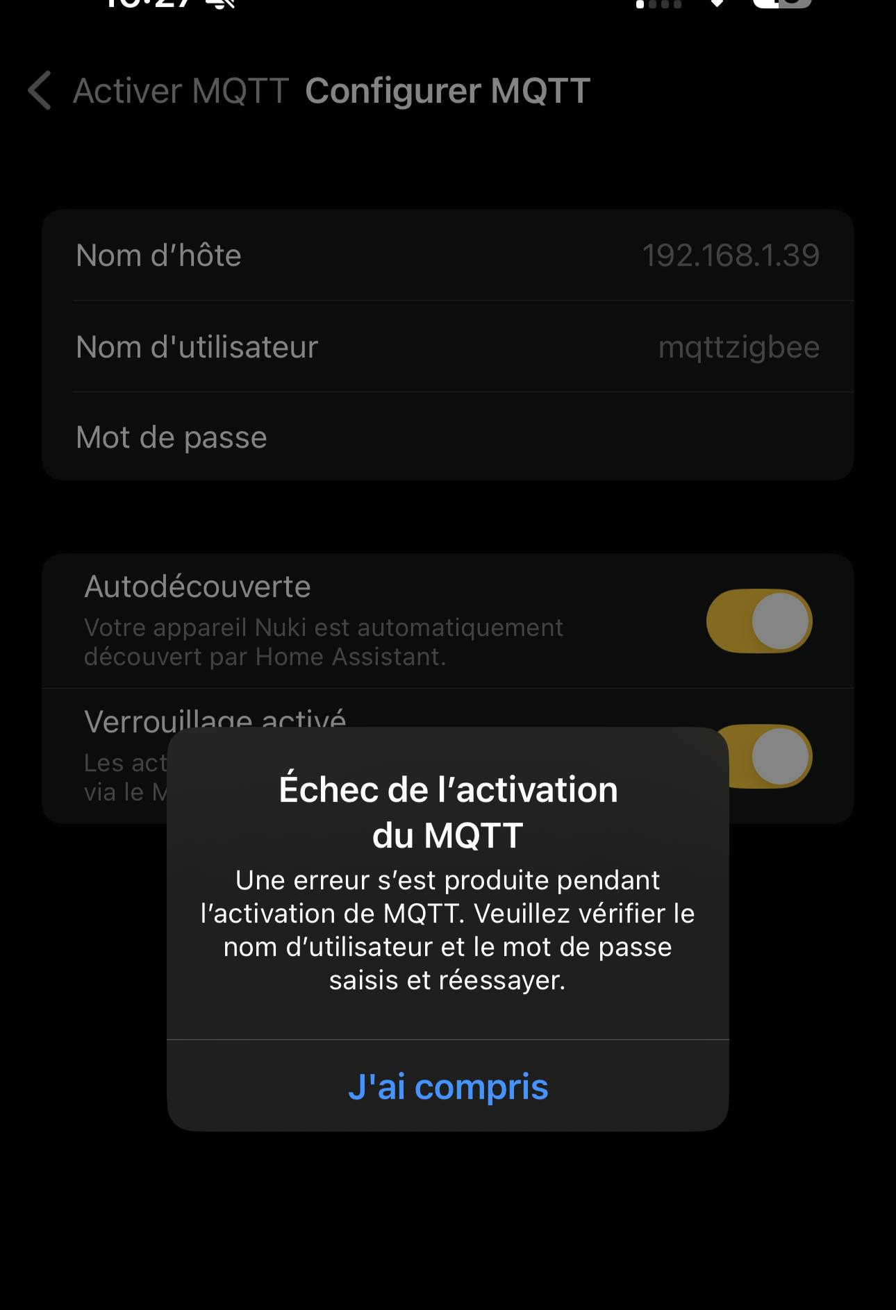 Il te faut le user et pass de ton MQTT sur HA. le mieux est de créer un utilisateur spécifique pour ta Nuki, au moins tu peux voir dans les logs de MQTT qui se connecte.