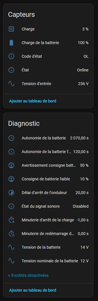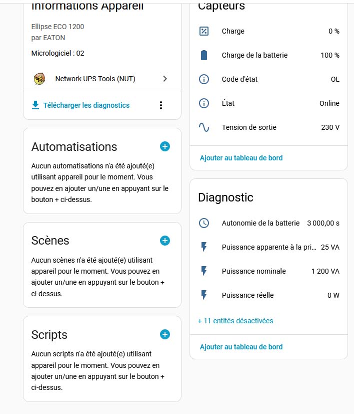 J’ai réussi à intégrer mon onduleur Eaton Eco 1200 USB dans HA en suivant le tuto de @golthar, complété par l’info manquante dans ce tuto (nom d’hôte) mais qui figure dans le message de @Rico3874.