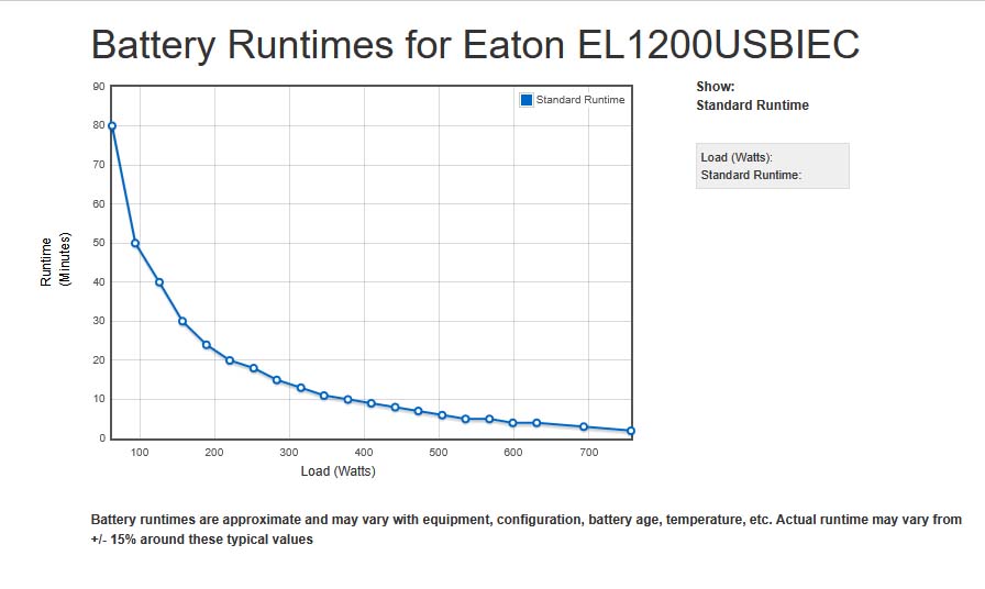 Il existe bien un graphique (courbe d’autonomie) sur le site Eaton pour chaque modèle (voir photo ci-dessous) mais sans plus d’explication.