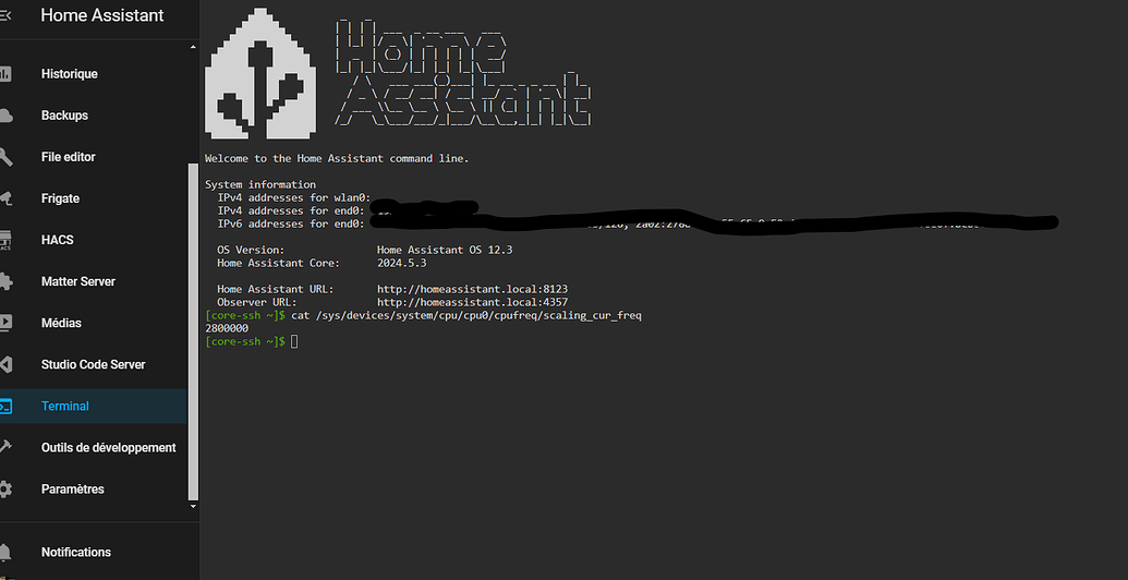 - Lorsque je redémarre mon Raspi 5 sans la carte sd (donc sur le ssd avec Home Assistant), la commande suivante me permet de vérifier la fréquence du processeur directement via le terminal de l’OS Home Assistant: « cat /sys/devices/system/cpu/cpu0/cpufreq/scaling_cur_freq »