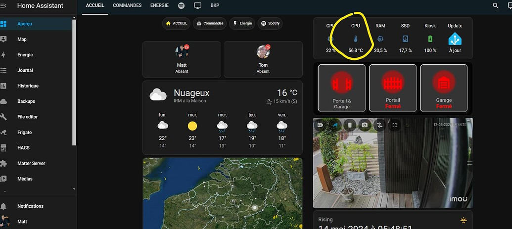 Sur mon tableau de bord Home Assistant, j’ai ajouté l’entité qui me permet de suivre la température du CPU, vu l’overclock. Je dispose d’un ventilateur. J’ai constaté avoir pris environ 10°C avec cet overclock: