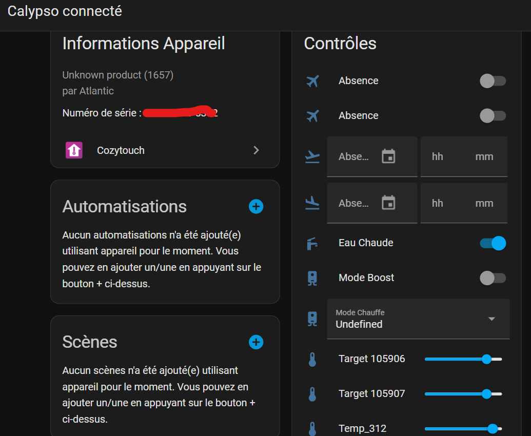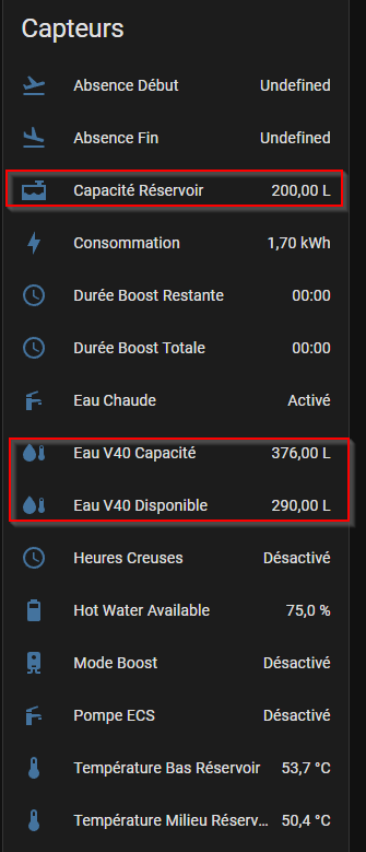 Au passage merci pour cette integration très sympa…j’exploite les 3 entités de bases qui m’interessent (mode absence, mode boost et % d’eau chaude restante). J’ai pu faire une petite automatisation qui me dit que je n’ai bientôt plus d’eau chaude (j’ai 2 ados à la maison