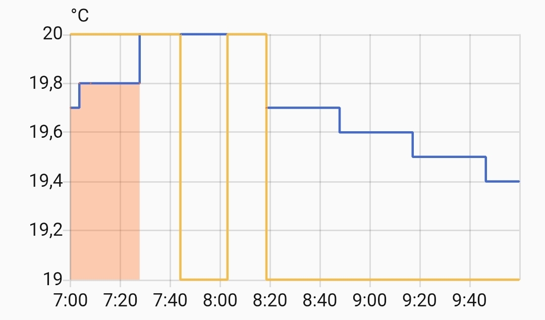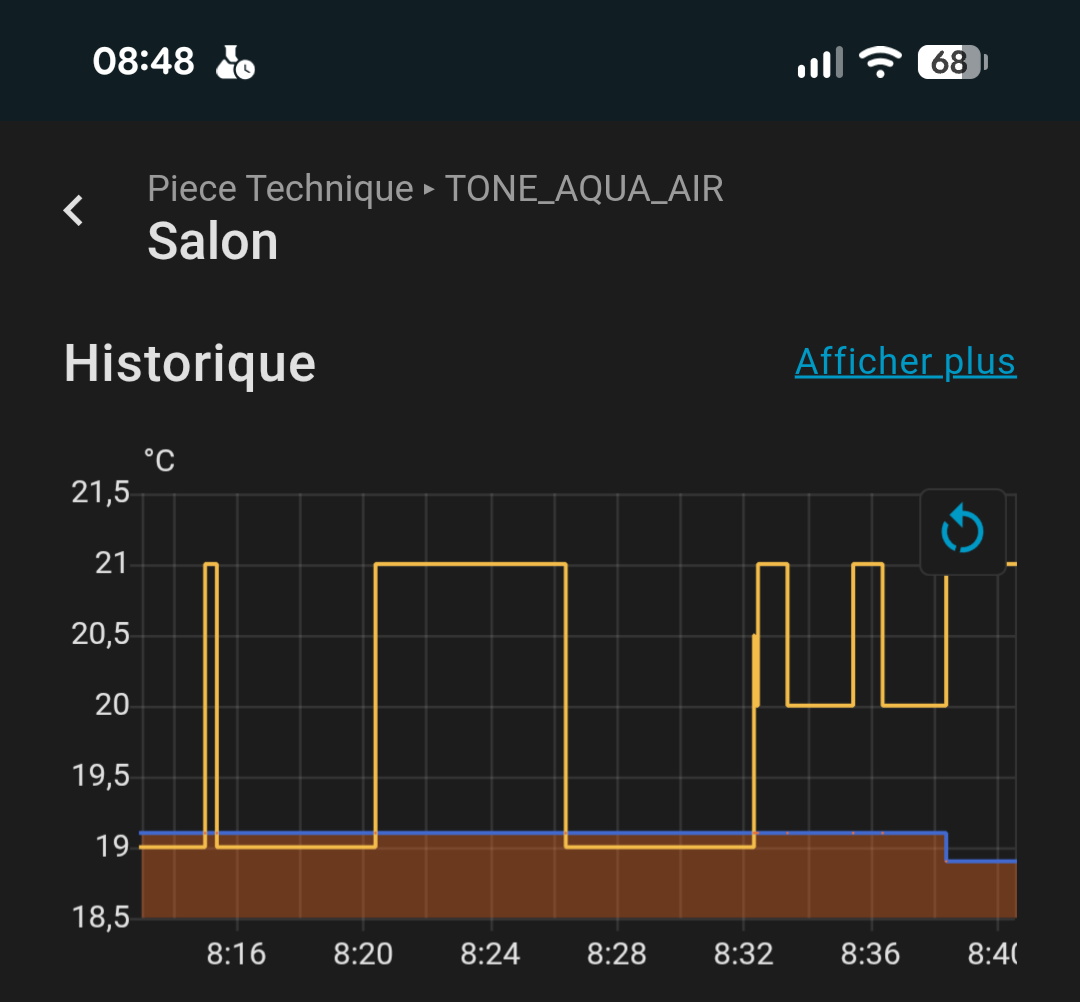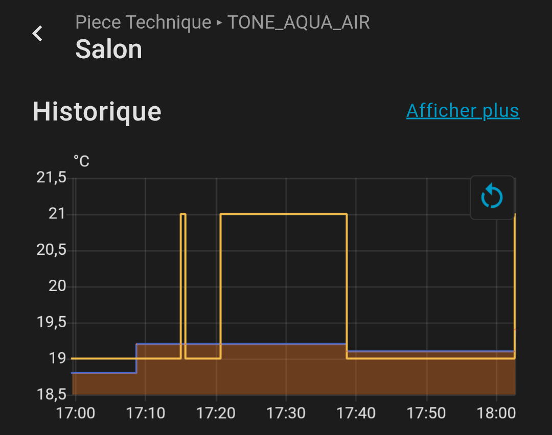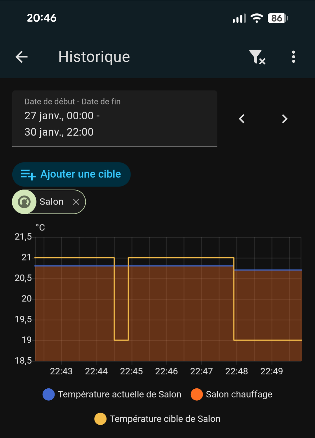 Une automatisation baisse la température de mon salon à 22h45. Mais mon thermostat a un comportement bizarre. La température est bien baissé, mais remontedsans la ou les minute(s) qui suivent. Puis elle redescend à nouveau ensuite.