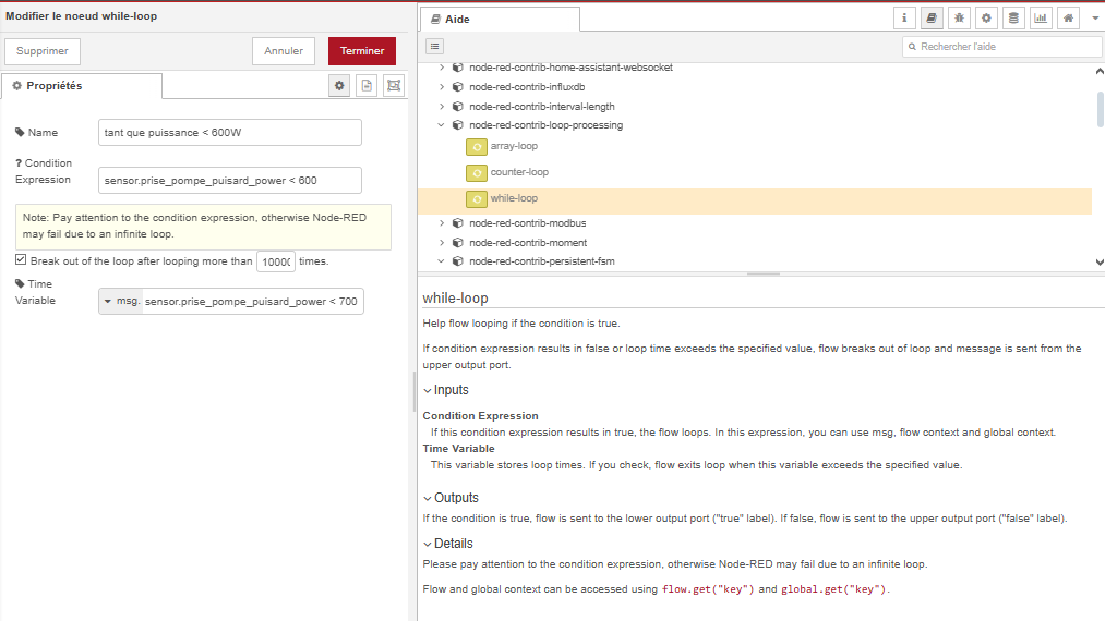 J’avoue avoir mésestimer l’approche de node-red en flux de données, je découvre un peu les possibilités et comme il y avait un paquet node-red-contrib-loop-processing avec la fonctionnalité, je me suis dit que j’allais tenter (je sais les while-do-while c’est pas top).