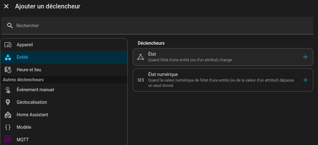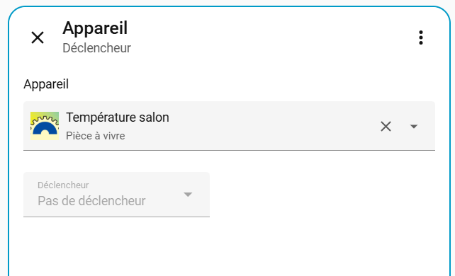 Cependant, je n’ai pas la possibilité de faire une automatisation à partir de ce capteur car lorsque je sélectionne un thermostat provenant du RFXCOM, quel qu’il soit, le système m’indique qu’il n’y a pas de déclencheur.