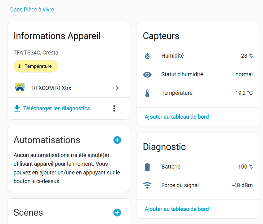 J’ai gardé après ma migration depuis Domoticz des thermostats Bresser dont les valeurs sont lues par un RFXCOM. Tout fonctionne très bien de ce côté.