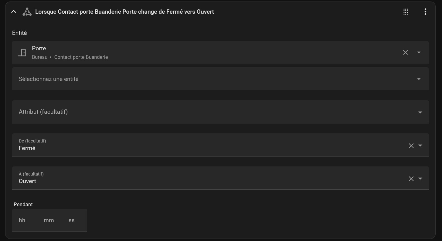 il doit y avoir un truc que je comprend mal ou pas car dans ma logique l’automatisation ne se lançait uniquement quand la porte passait de l’état fermé à ouvert, mais en fait se déclenche temps que la porte est ouverte.