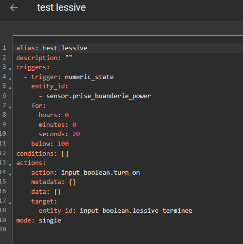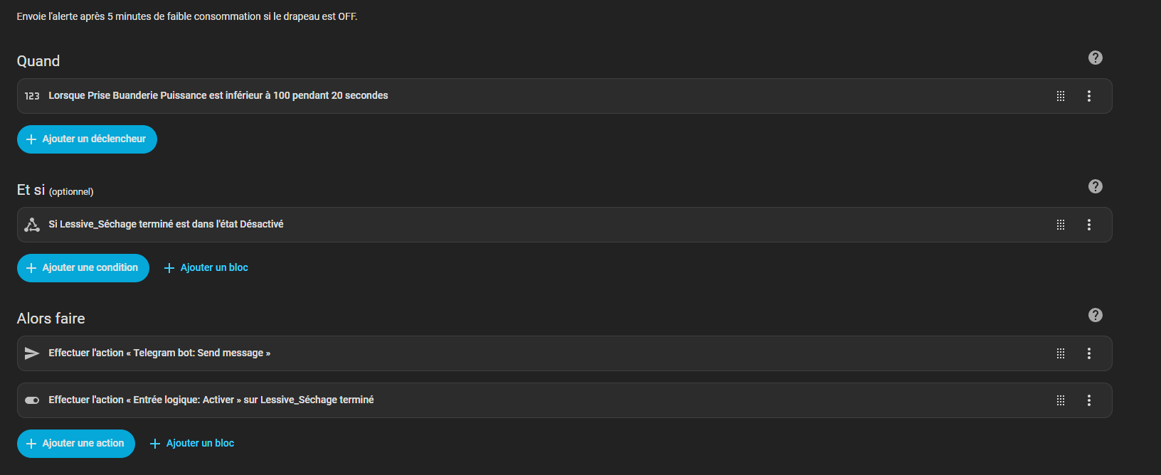 Bonjours, je tente de créer une automatisation qui teste la puissance consommée par la machine à laver, si elle est <10 pendant x minutes , j’envoie un message Telegram “lessive terminée”.