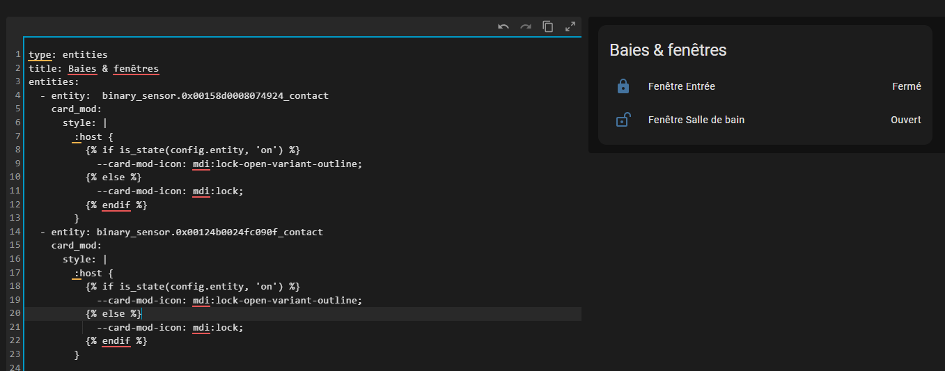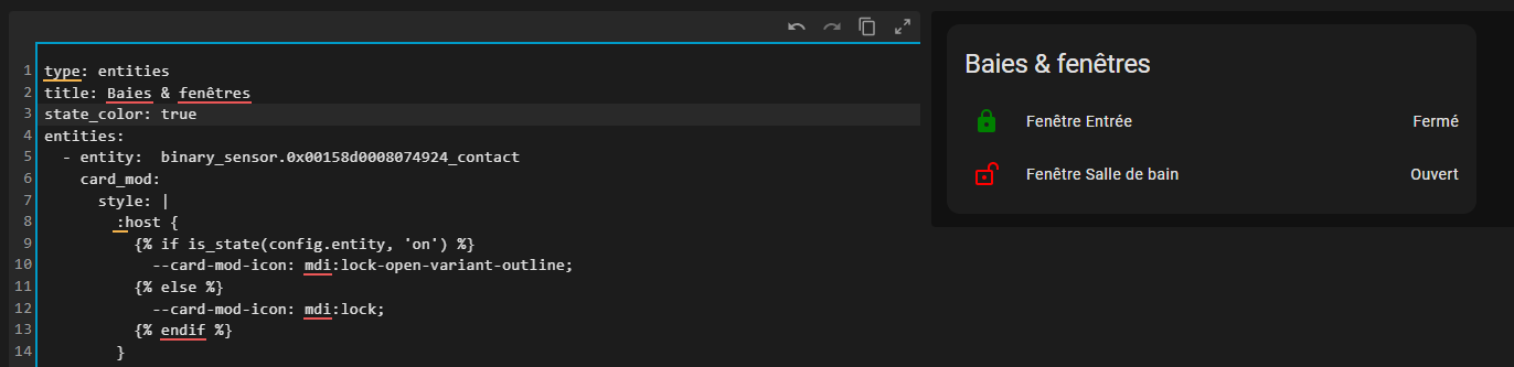 Bonjour à tous,En voulant apporter une personnalisation à mon TdB, j’ai fait une connerie …J’ai ajouté une tuile “entities” dans l’interface graphique puis je l’ai réouverte en mode YAML pour lui ajouter un test conditionnel pour faire apparaitre une icone différente selon un état “ouvert/fermé” de mes capteur.Le 1er test fonctionnait mais j’avais toujours un texte en fin de ligne redondant avec l’icône.Pour supprimer ce texte, j’ai ajouté ceci en début de mon YAML de la tuile “entities” (toujours depuis l’interface graphique) :