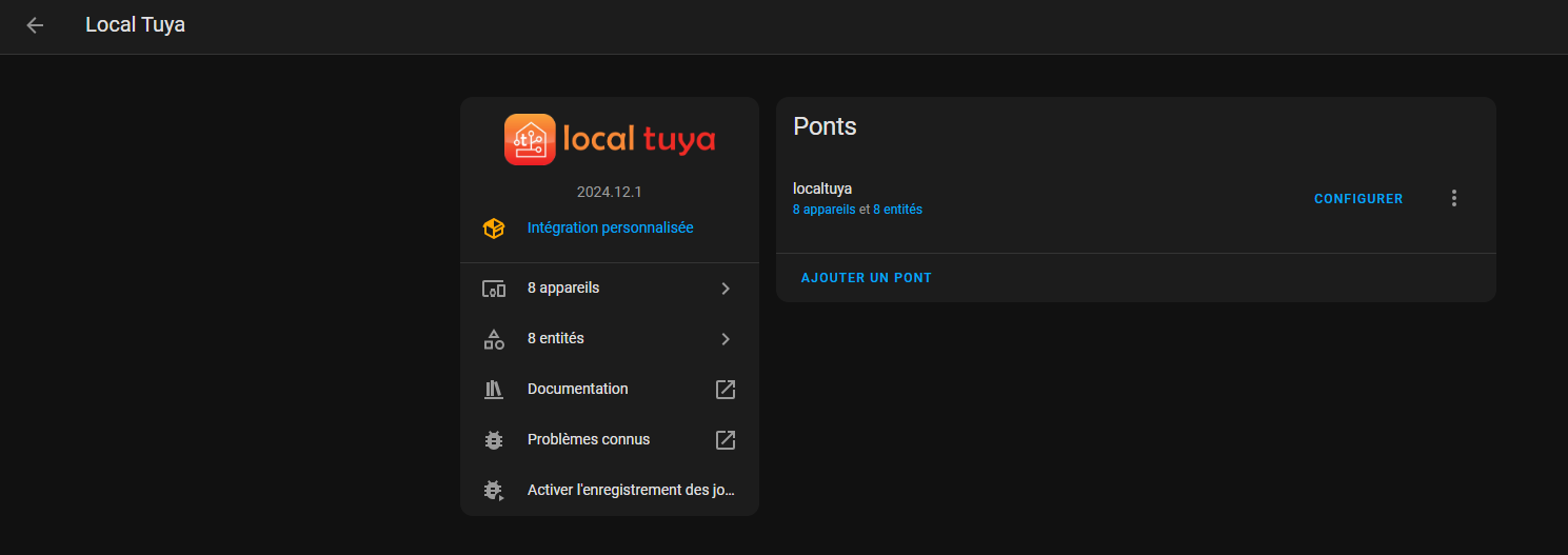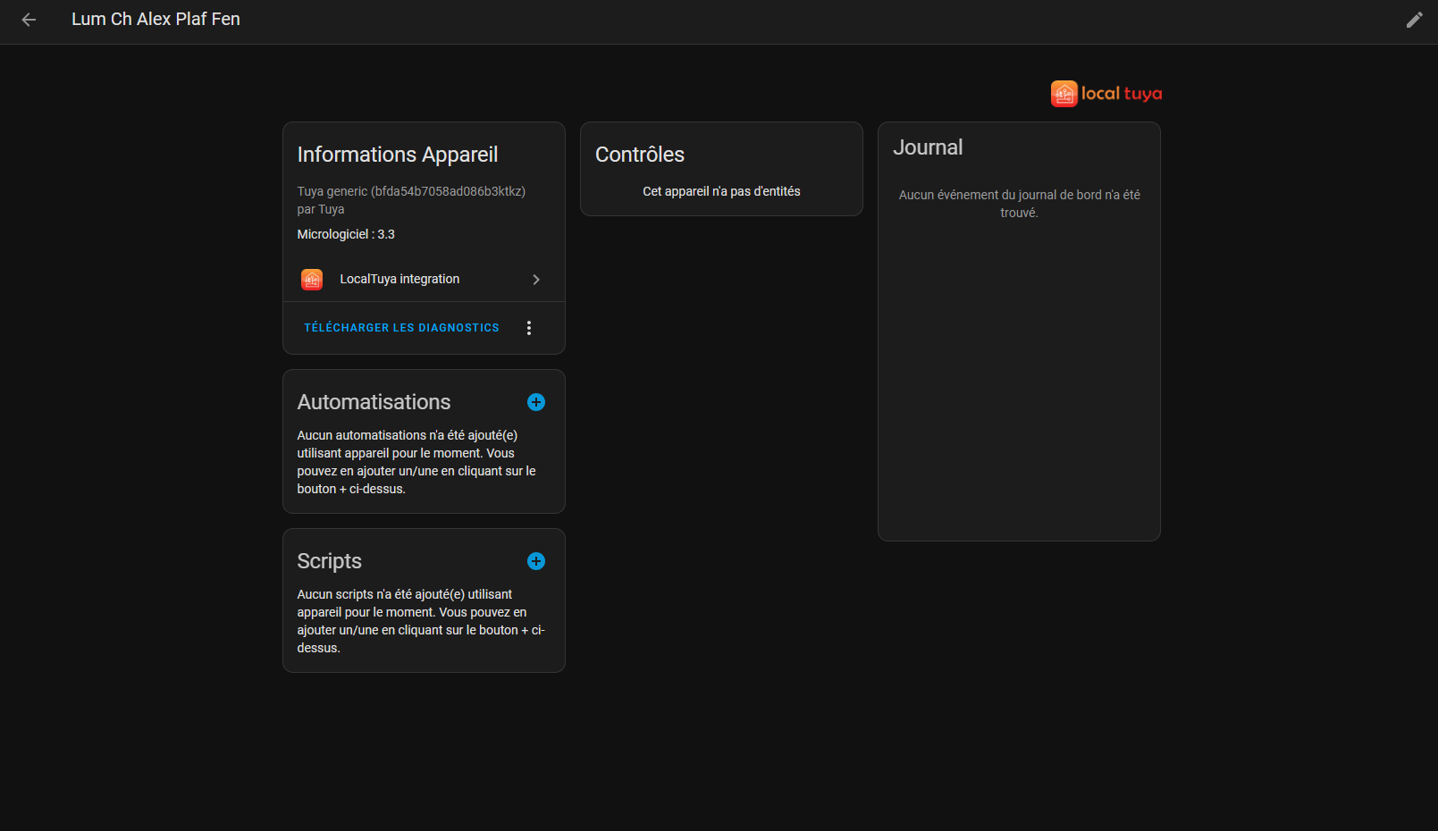 Egalement, après l’ajout de la lumière sur « localtuya », seule l’appareil apparait mais l’entité de contrôle.
