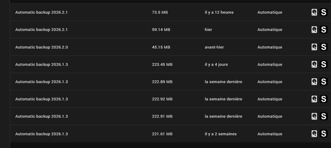 Premier gros problème avec HA : Je viens de me rendre compte que les graphiques de HA ne montraient plus aucunes données antérieures au 5/2. Pour tenter de les récupérer et quitte à perdre toutes celles enregistrées depuis cette date, je me suis décidé à faire une restauration parmi celles-ci :