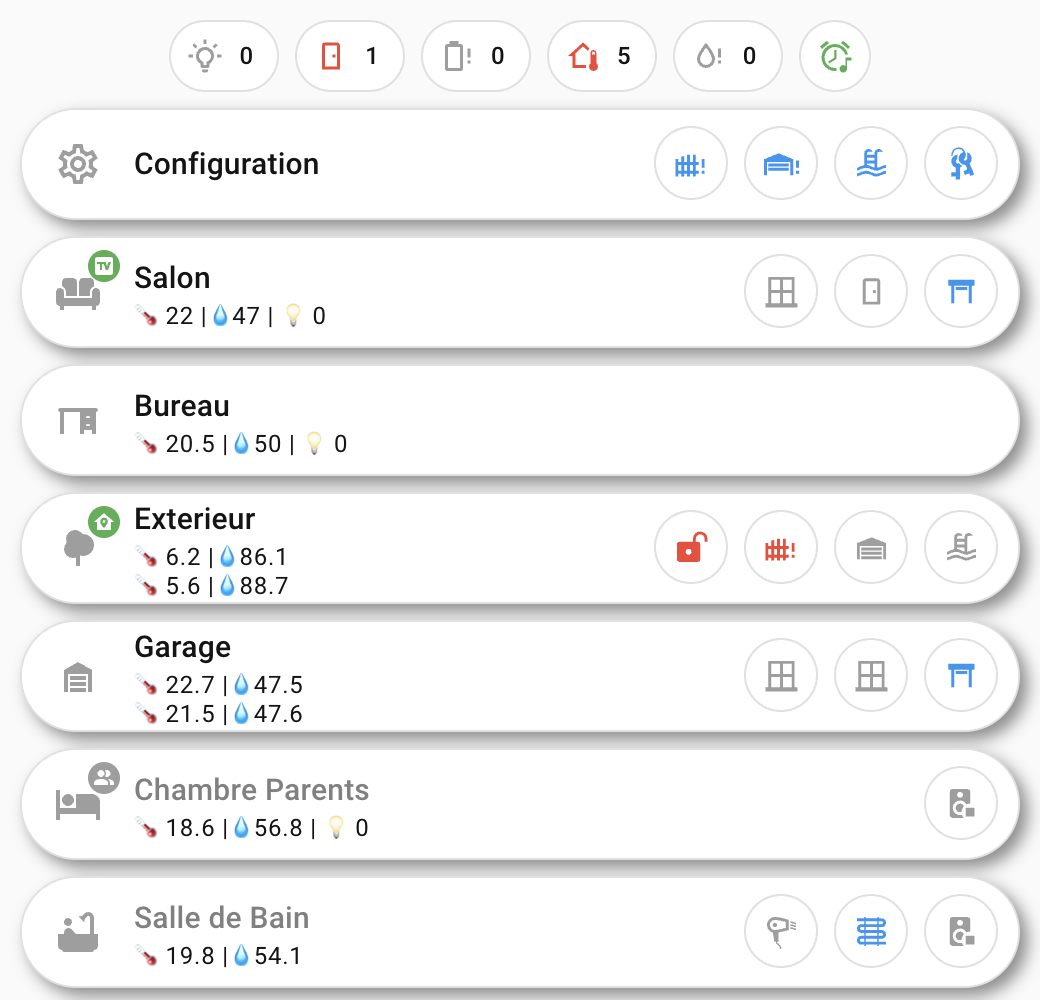 Chaque section est une carte à base de button-card qui contient des chip-card inclus pour des actions rapides (maximum 4 par souci de place)