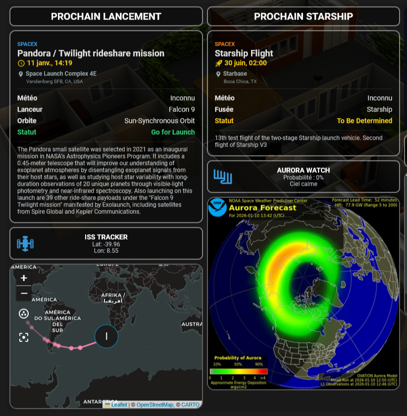 J’ai revu la partie météo, je ne savais pas trop quoi mettre en bas à droite hors la carte lune que je vois en live sur le plan, du coup j’ai mis l’ISS ![]()