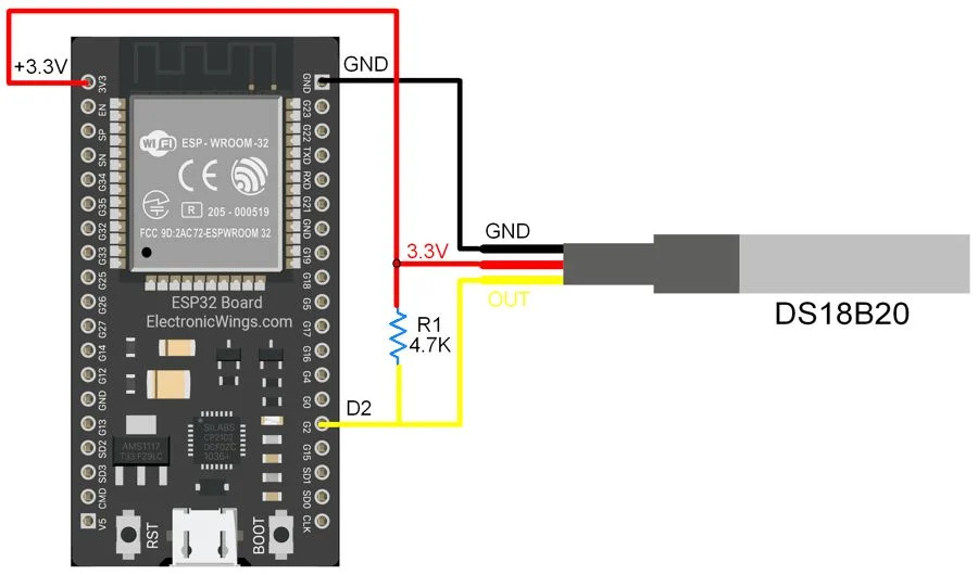 Pour le câblage de la DS18B20, rien de sorcier, tu peux t’inspirer de ce schéma pour le câblage de la sonde, et pour les pin de connexion te référer à ce qui est écrit sur le PCB du heltec pour retrouver ton GND, 3V3 et le GPIO 33
