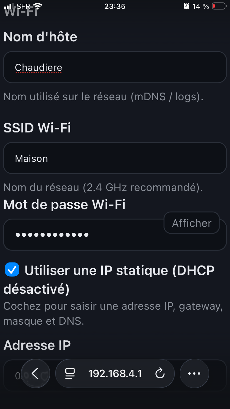 Le Heltec s’est connecté au Wifi et je me connecte dessus avec l’adresse précédemment renseignée.