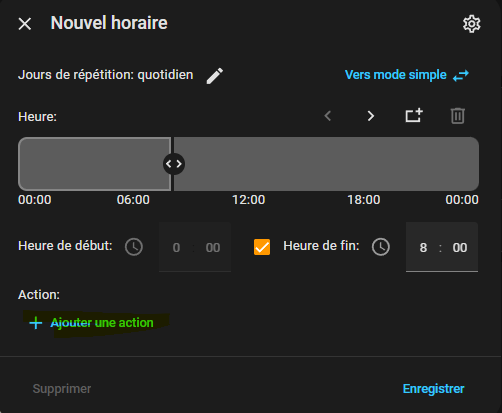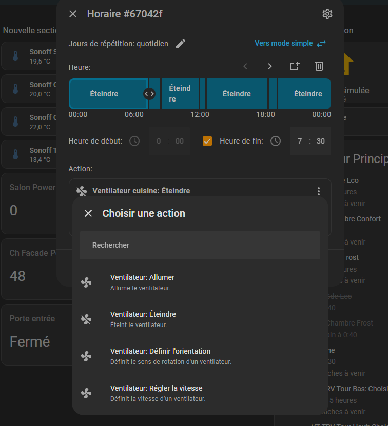 Mais si je crée un schedule avec la carte scheduler principal l’action possible est plus limitée et surtout je ne peux créer qu’une action apparemment, allumer OU régler la vitesse.
