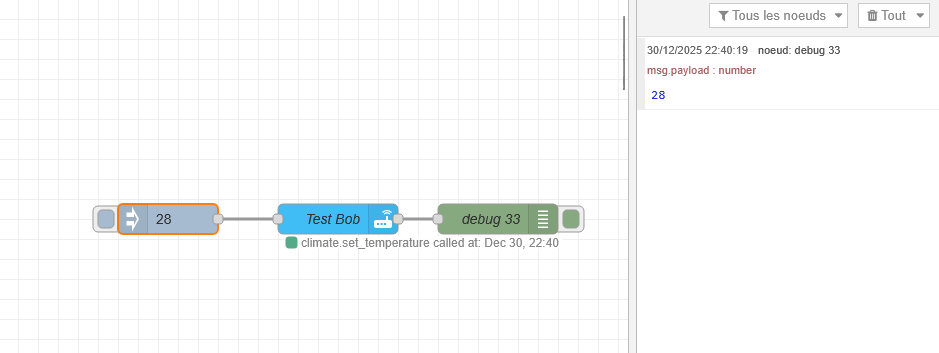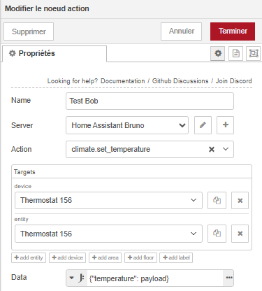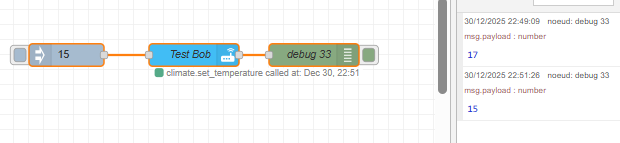 [{"id":"54100bd2cf37360c","type":"tab","label":"Flux 3","disabled":false,"info":"","env":[]},{"id":"77cb872558d88a90","type":"debug","z":"54100bd2cf37360c","name":"debug 33","active":true,"tosidebar":true,"console":false,"tostatus":false,"complete":"false","statusVal":"","statusType":"auto","x":980,"y":320,"wires":[]},{"id":"eed4c0b0d710be3f","type":"inject","z":"54100bd2cf37360c","name":"","props":[{"p":"payload"},{"p":"topic","vt":"str"}],"repeat":"","crontab":"","once":false,"onceDelay":0.1,"topic":"","payload":"22","payloadType":"num","x":650,"y":320,"wires":[["1b0d7930c6634d50"]]},{"id":"1b0d7930c6634d50","type":"api-call-service","z":"54100bd2cf37360c","name":"Test Bob","server":"443ff1c5.63d78","version":7,"debugenabled":false,"action":"climate.set_temperature","floorId":[],"areaId":[],"deviceId":["4d55ba28bced5da729b06194b2d0cb72"],"entityId":["climate.thermostat_43"],"labelId":[],"data":"{\"temperature\": payload}","dataType":"jsonata","mergeContext":"","mustacheAltTags":false,"outputProperties":[],"queue":"none","blockInputOverrides":true,"domain":"climate","service":"set_temperature","x":820,"y":320,"wires":[["77cb872558d88a90"]]},{"id":"443ff1c5.63d78","type":"server","name":"Home Assistant Bruno","version":5,"addon":true,"rejectUnauthorizedCerts":true,"ha_boolean":"y|yes|true|on|home|open","connectionDelay":true,"cacheJson":true,"heartbeat":false,"heartbeatInterval":"30","areaSelector":"friendlyName","deviceSelector":"friendlyName","entitySelector":"friendlyName","statusSeparator":"at: ","statusYear":"hidden","statusMonth":"short","statusDay":"numeric","statusHourCycle":"h23","statusTimeFormat":"h:m","enableGlobalContextStore":true},{"id":"0d99a14cf9e78d58","type":"global-config","env":[],"modules":{"node-red-contrib-home-assistant-websocket":"0.79.0"}}]