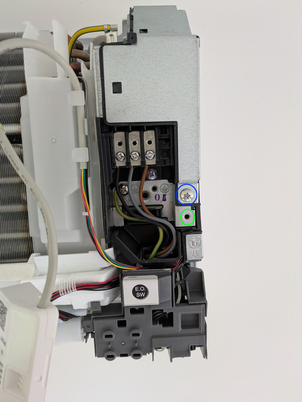 Maintenant dévissez le cache de l’alimentation (que j’ai déjà enlevé sur la photo ci-dessous) protégé par la vis verte ainsi que le cache de la carte de commande avec la vis bleue.