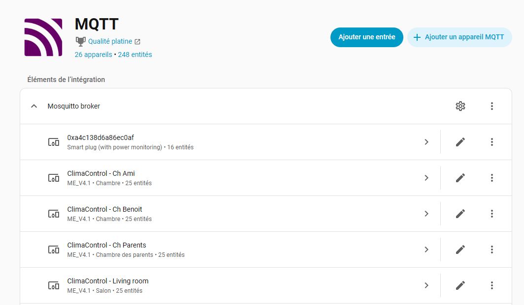 Cliquez sur « Save », et vous devriez voir apparaître d’ici quelques minutes le module dans la liste des appareils géré par Mosquito Broker (Paramètres > Appareils et Services > Intégrations > MQTT), sous le nom « ClimaControl ».