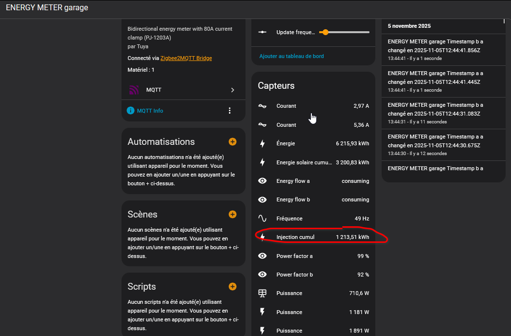 J’ai fait un rafraichissement F5, mais rien de mieux. Et si je remets dans ce que j’avais avant le 2 OCT dans Injection dans le réseau à savoir “ENERGY METER garage injection cumul“ à la place de mon sensor template nouvellement créé depuis le problème et bien j’obtiens l’inverse.