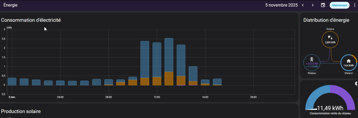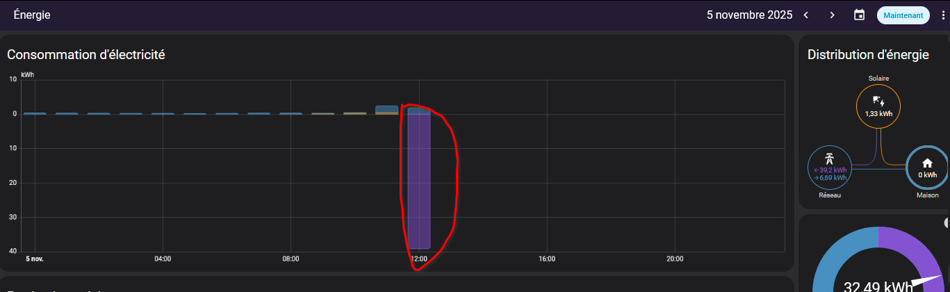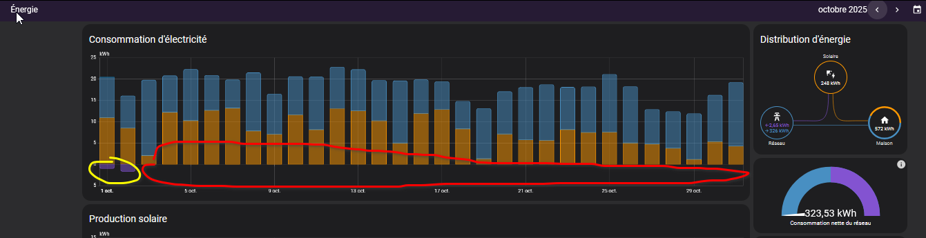 J’ai tenter de réintégrer l’entité dans l’onglet energie et je n’ai plus que 2 messages d’erreur sur 4 mais rien ne change et ce qui m’inquiète, c’est que, autant j’ai bien la puissance lorsq’un élément tourne à l’instant T, mais plus rien ne se « cumule » dans « Energy produced a » e « Energy produced b », les chiffres sont figés depuis début octobre visiblement.