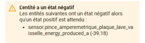 Je pensais avoir résolu mon problème dans le panneau ENERGIE en ayant créé mon sensor template qui prend la valeur absolue.