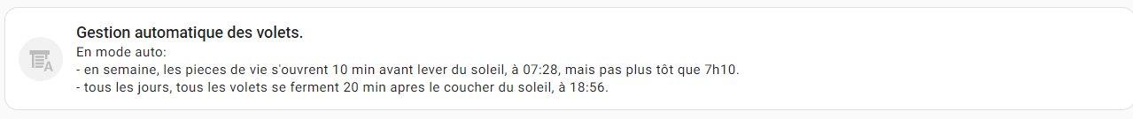 - tous les jours, tous les volets se ferment 20 min apres le coucher du soleil, à {{ (as_timestamp(state_attr("sun.sun", "next_setting"))+1200)|timestamp_custom('%H:%M',true)}}.