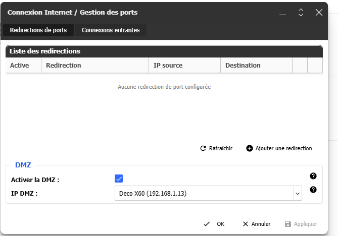 En gros actuellement la DMZ arrive sur le premier DECO, et lui il route 4 ports vers les différentes machines de son réseau (443, 1194 pour le vpn, et 3 ports pour le syno)