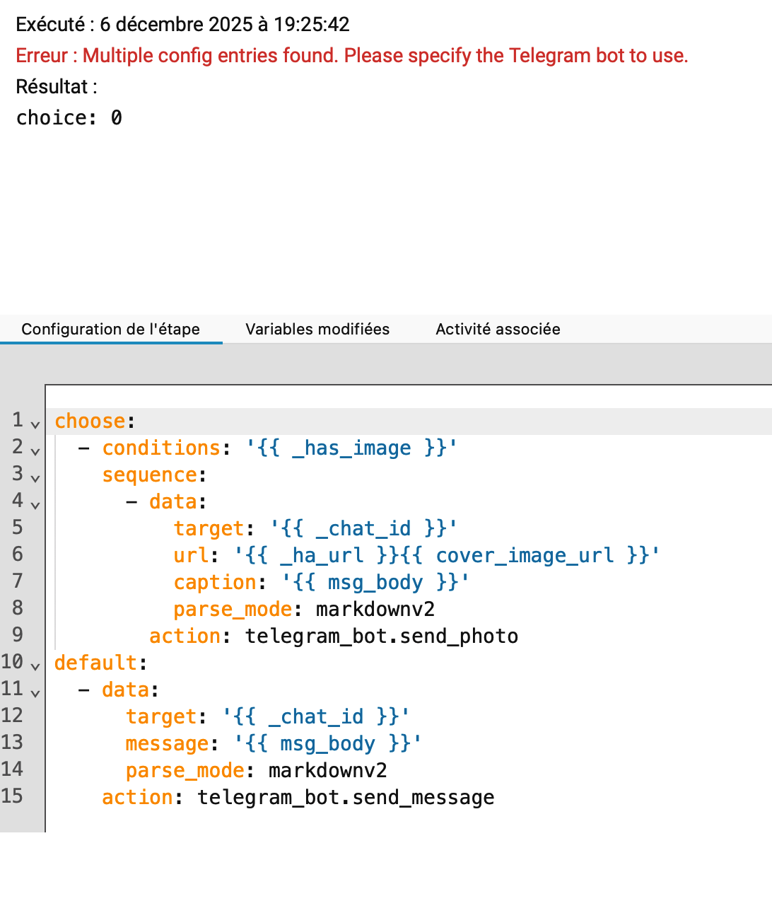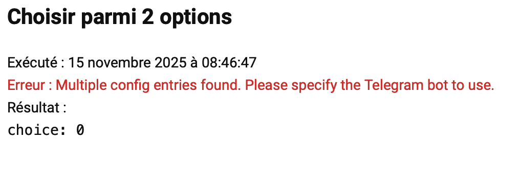 Quand je change le paramètre « Telegram Chat ID » dans l’image ci-dessus, suivant ce que je met, le message d’erreur change. Si je met un id qui n’existe pas par exemple, j’ai bien une erreur « target » car forcément il ne trouve pas l’ID. Ici c’est comme si il la trouve mais voit aussi l’autre alors que je met bien celle du groupe…