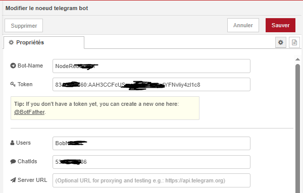 Par exemple dans la conf Node Red, on voit que l’ID du début du token n’est pas le chat id, je pensais au départ que ce devait être le cas: