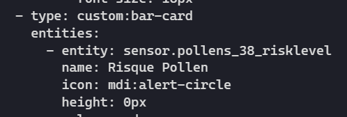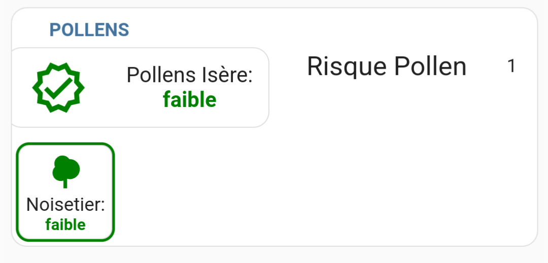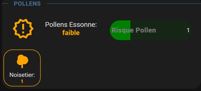 Le niveau d'alerte est de {{ states('sensor.pollens_'+ dpt|string + '_risklevel') }} et voici les valeur actives :