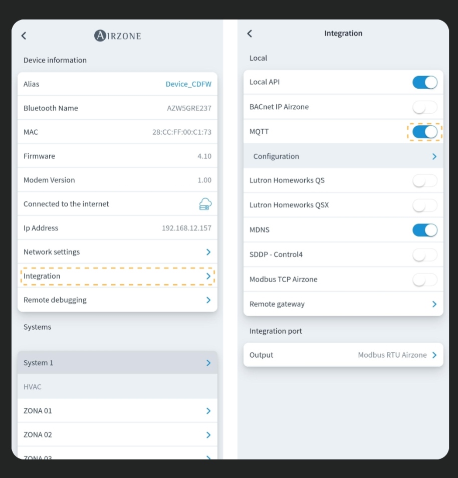 Le webserveur de chez airzone fonctionne aussi en local, Via l’integration airzone dans Ha il faut renseigner l’ip locale.