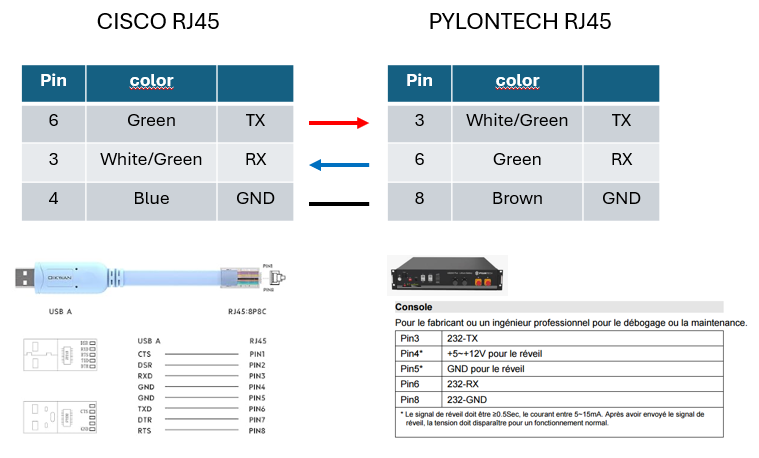 d’une part, le cablage d’une prise rj45 n’est pas standardisé pour un protocole serie. chacun peut faire ce qu’il veux dans son coin.