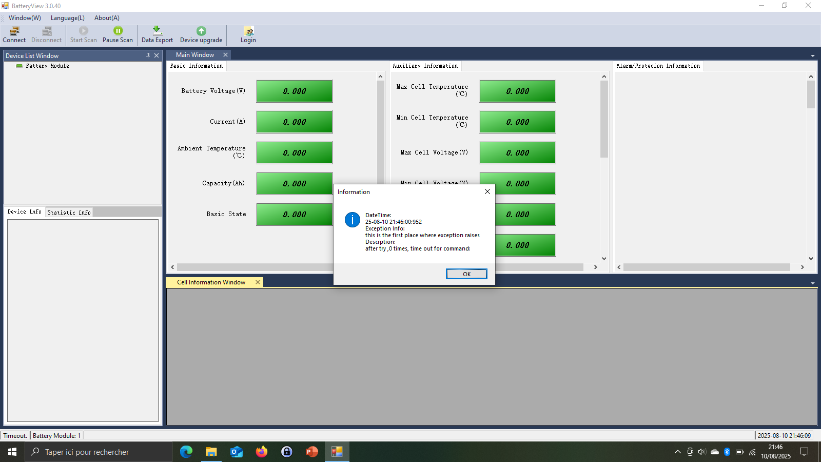 J’ai essayé avec le software « BatteryView » venant du support Pylontech, je tape en timeout.