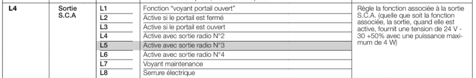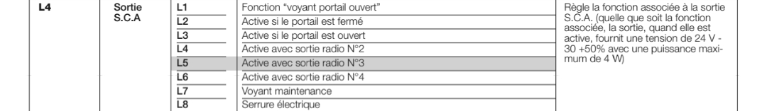Et la sortie sca pour récupérer l’info portail ouvert, en modifiant dans les paramètres de 2e niveau L4. Attention la sortie delivre du 24Vdc donc prevoir un relais.