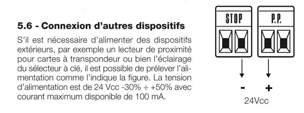 Pour des modules le 24Vdc que tu peux récupérer entre stop et p.p mais attention 100ma c’est très peu ou sinon des modules 230v comme les shelly 1 avec des contacts sec feront aussi l’affaire.