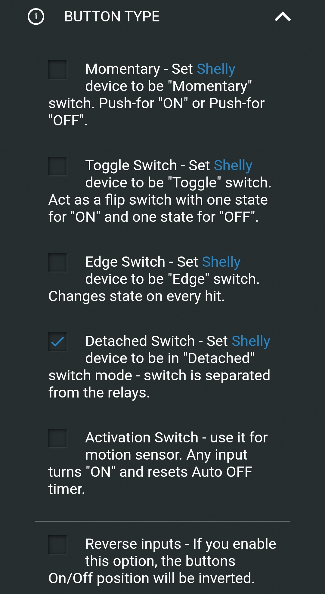 Normalement tu peux te connecter en local à l’interface web du shelly ou via l’appli pour programmer le detached switch et le timer auto-off des contacts des modules.
