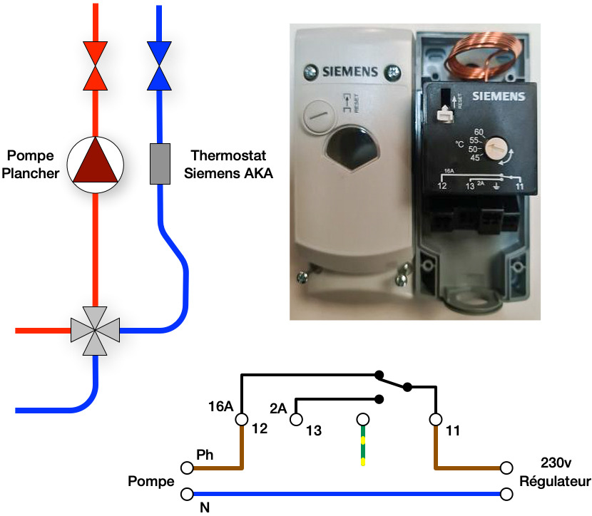 J’ai une pompe de circulation de chauffage au sol alimentée en 230V avec un thermostat en série qui la coupe si la T° de retour est supérieure à 45 °C