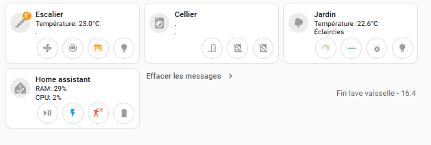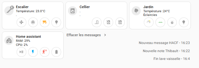 J’ai ensuite une petite section de dashboard affichant le contenu des input_text de façon conditionnelle suivant la présence ou non de message pertinent, ainsi que le bouton permettant d’effacer les messages s’il y en a :