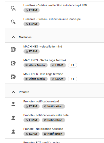 Bonus: dans l’interface des automatisations, j’ajoute des tags « ecam » / « alexa-media » / « notification » pour pouvoir filtrer quelles automatisations utilisent quel moyen de notif: