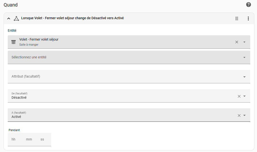 J’ai ensuite fait une automatisation pour agir sur le relai nommé « switch.salon_relais_volet_roulant_salle_a_manger_right » pour la fermeture avec en déclencheur, le passage de « off » à « on » de mon entrée « input_boolean.volet_fermer_volet_sejour » :