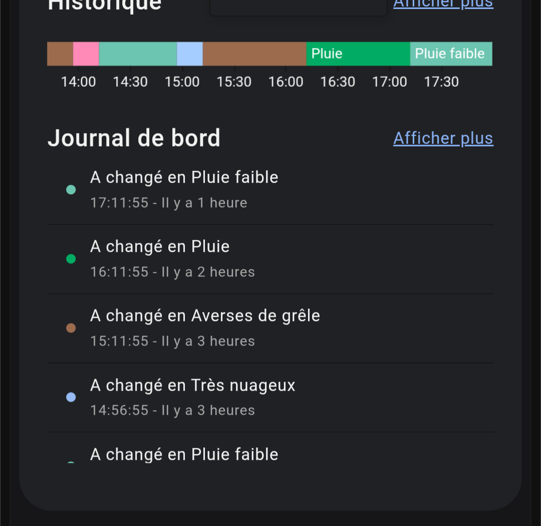 J’utilisais auparavant un Markdown avec l’intégration OpenWeatherMap pour créer des entités comme sensor.maison_condition_jour_1, mais l’intégration est devenue payante et je n’arrive plus à reproduire cette fonctionnalité.