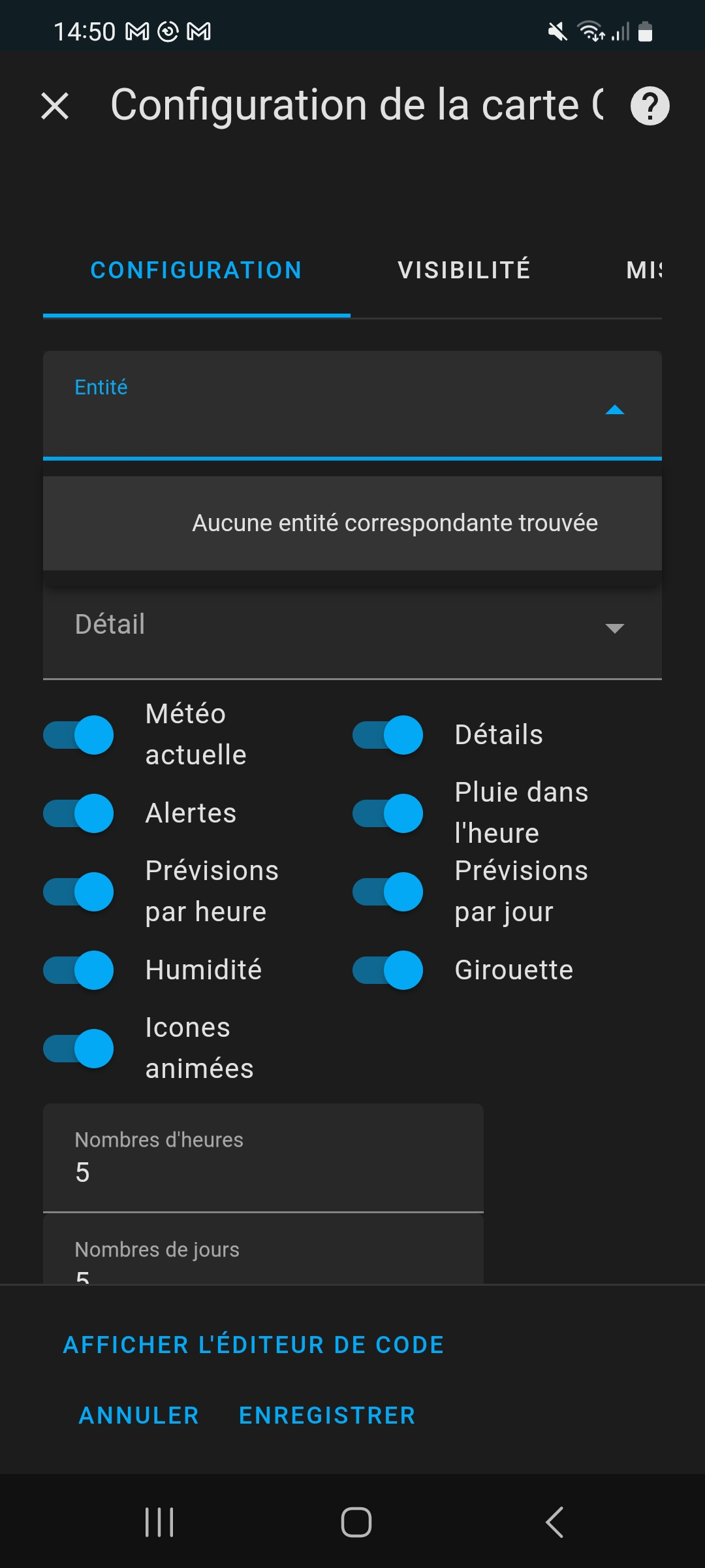 Chez moi, elle se configure automatiquement. Mais il faut installer l’intégration Météo-France et avoir au moins 1 entité météo.