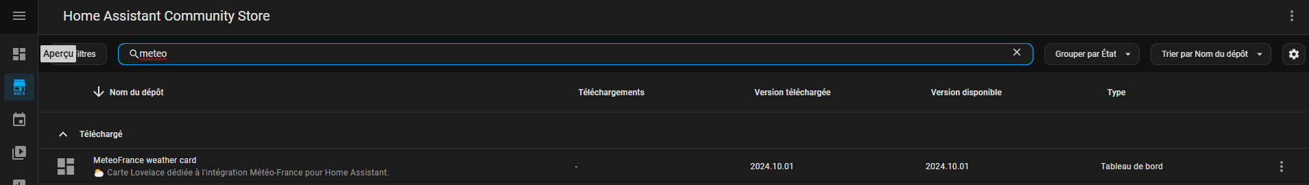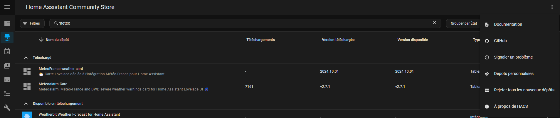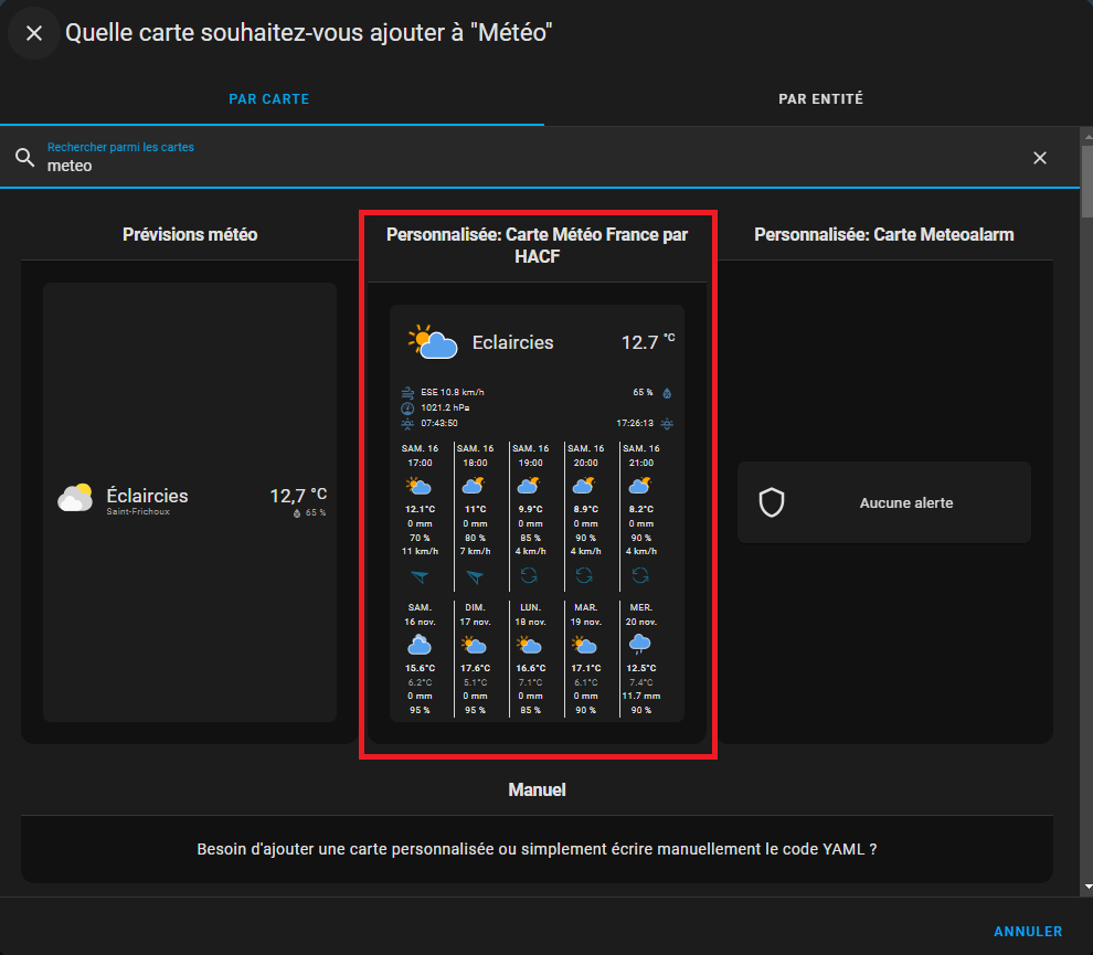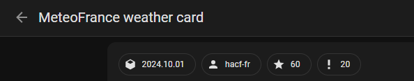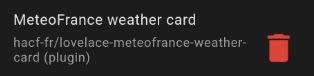 Il faut dans HACS, ajouter la carte météo france de HACF dans le dépôt personnalisé. À partir des 3 points et dépôts personnalisés.