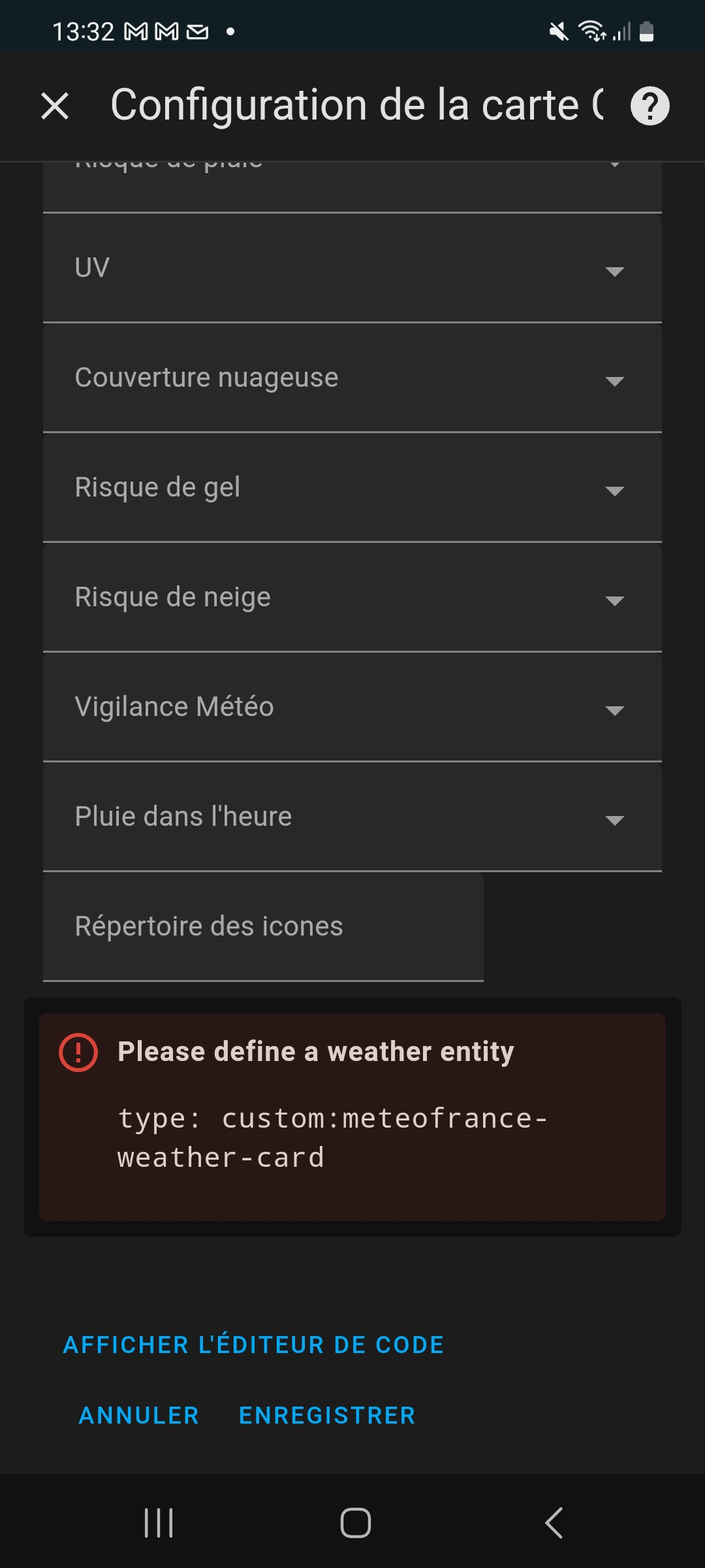 C’est la mauvaise carte météo france. Celle que tu utilises est obsolète et n’est pas développer par HACF.