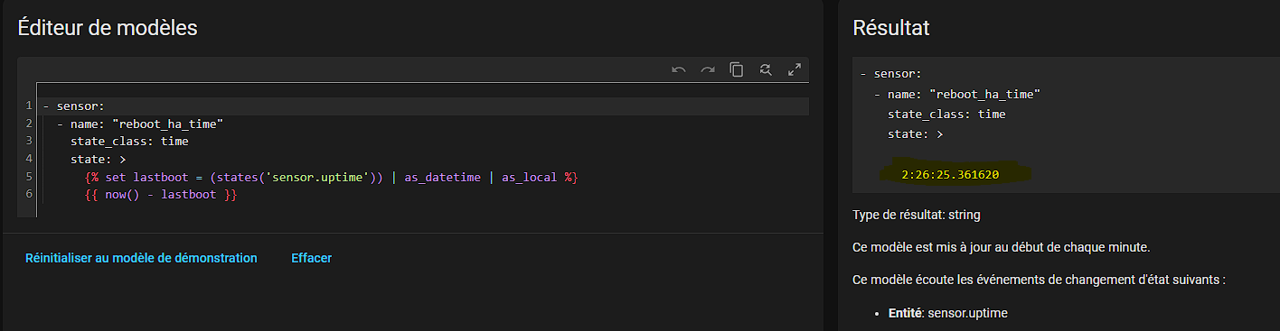 J’ai créé un template ‹ reboot_ha › qui me renvoi le bon temps depuis le redémarrage de HA :